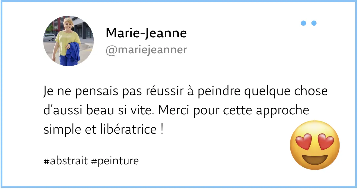 C’est un programme en ligne guidé, en vidéo, pour apprendre à peindre une œuvre abstraite à partir de ton ressenti. Pas besoin de savoir dessiner ou d’avoir un niveau artistique.